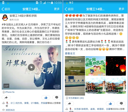 活动以线上线下的方式同时进行。3月19日起,网络文明志愿者在微博上发起“争当指尖上的志愿者”讨论话题,同学们积极发表自己的看法与感悟。同时,志愿者们还在腾讯空间展开转发“争当指尖上的志愿者”集赞,在微信计科助手公众号进行宣传,积极动员同学们加入网络文明志愿者队伍,为线下活动的开展营造了良好氛围。