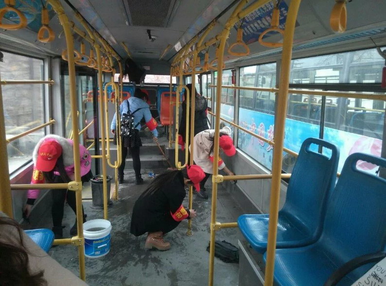 志愿者们分工协作,有的清洗公交车身,有的负责清扫车厢,有的负责打扫车站卫生。杨如雪同学特别细心,在清扫过程中不忘为乘客着想,她先用湿抹布将窗户抹了一遍,再用干抹布将靠近座位附近的窗户擦干,“如果不擦干,乘客待会儿上车找座位坐下来就容易蹭到,袖子会沾上水。”谈及义务擦洗公交车的初衷和想法,她脸上洋溢着笑容:“公交车代表着城市形象,一辆干净的公交车能让老百姓感受到城市的文明,我们要从这些有意义的小事做起,参与社会实践,为城市发展做出一点点贡献。”