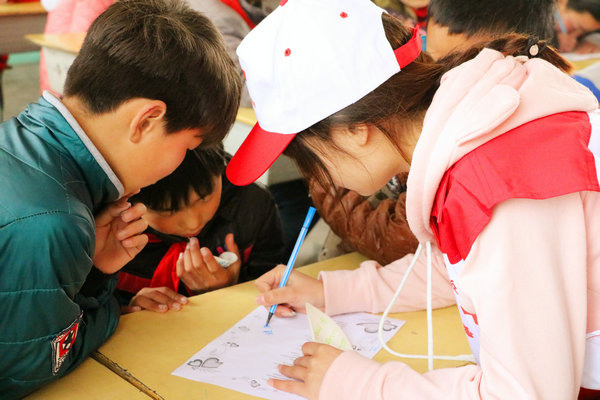 志愿者们通过淮南市红十字会了解到,刘集红十字小学就读的小朋友大部分是留守儿童,这些小朋友们只有在假期才能见到父母一面。为了让这些孩子们拥有一个阳光快乐的童年、摆脱心理的阴影,志愿者们还引导他们一起玩一些心理小游戏,用击鼓传花的形式选出小朋友,让他们写下好朋友的一些优点,目的是让他们发现别人的优点并学会赞美别人。游戏带动了每位小朋友的积极性,欢快的笑声在教室里回荡。