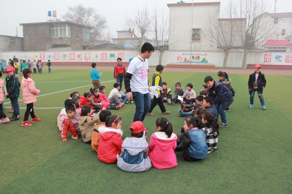 在学校操场上,志愿者和小学生们举行了趣味运动会,踢足球、捆腿跑、踢毽子,大家大手牵小手,喝彩声不断。在游戏互动环节,志愿者还给小学生们发放了文具等小礼品。在志愿者们的组织下,小朋友们参与到横幅签名活动中,大家在写着“爱心汇聚力量,真情播种希望”的横幅上签下了自己的名字。