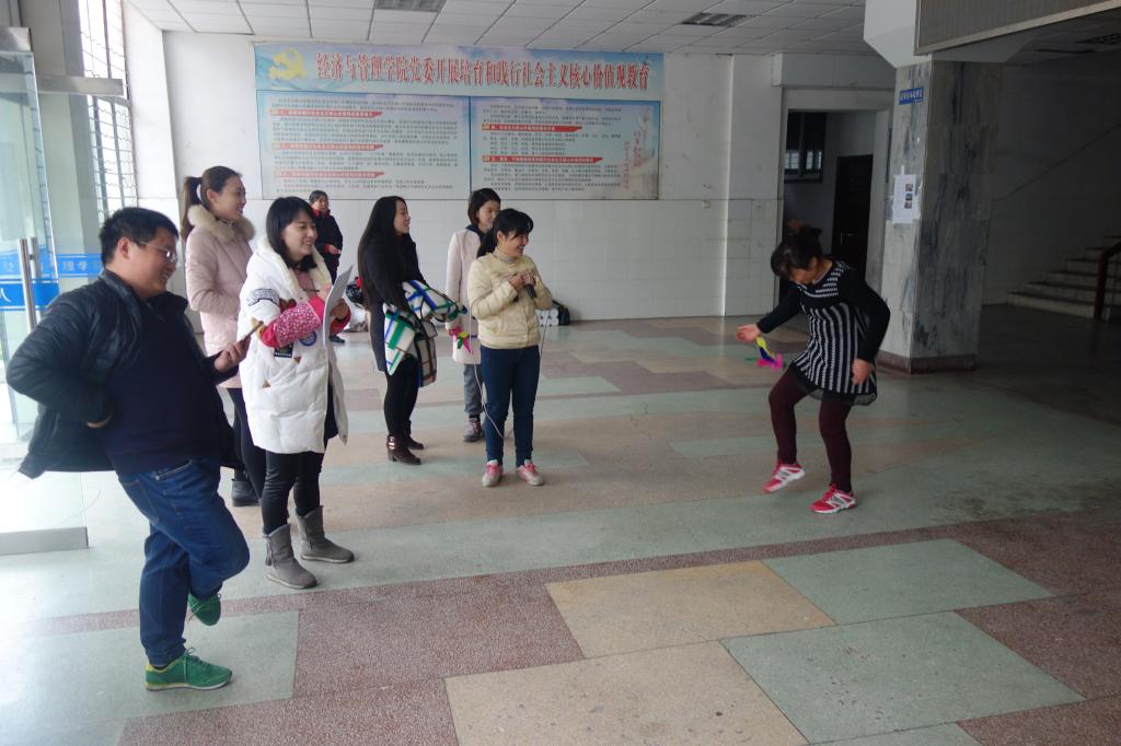 为庆祝“三八”妇女节,3月9日下午,人文学院分工会教职工跳绳、踢毽子比赛在学院办公楼前举行。学院教职工积极参加比赛。