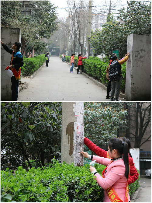 志愿者在清理小区小广告