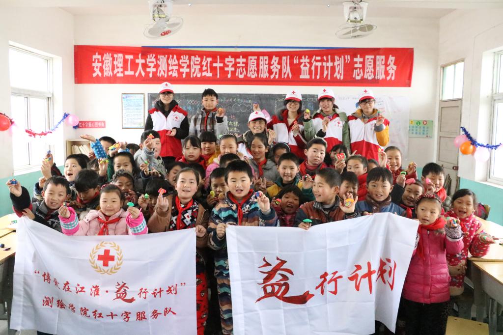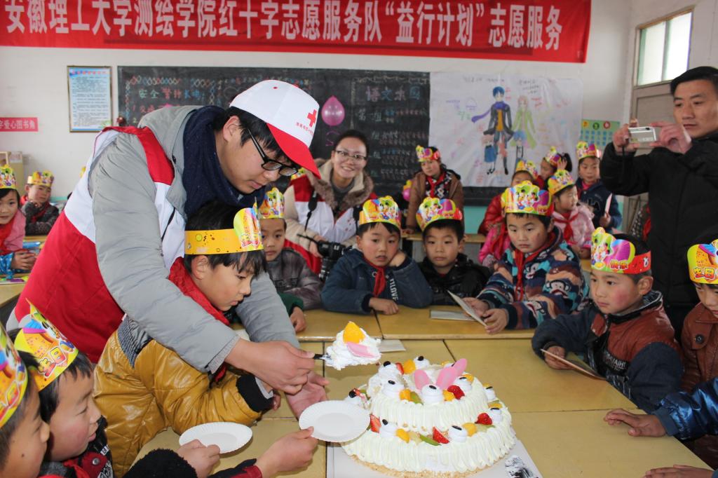 测绘学院红十字志愿服务队继去年12月之后,于1月9日上午再次来到安徽省淮南市红十字会志愿服务基地——淮南市潘集区夹沟乡刘集红十字博爱小学,开展该队承担的省红十字会“益行计划”项目“七彩阳光 爱心课堂——关爱留守儿童”活动。红十字队16名志愿者与这里的小朋友们同过生日、共迎新年,度过了一个愉快而温馨的周末。