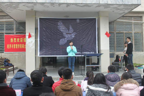 12月13日是南京大屠杀国家公祭日。为悼念在南京大屠杀中遇难的三十万同胞,更好地对学生进行爱国主义教育,经济与管理学院联合人文社会科学学院于12月13日下午在经管楼门前举办了“纪念南京大屠杀78周年”演讲比赛。