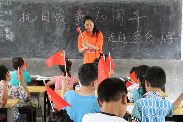 7月22日,志愿者走进潜山县昆仑希望小学,开展以“红色记忆”为主题的教育活动。活动中,同学们教小学生唱红色歌曲,讲述抗战事迹,诵读红色经典《红岩》、《沁园春 • 雪》、《祖国啊,我亲爱的祖国》,为小学生们发放小国旗,带领大家到校园中编排抗战话剧等。活动在小学生们的欢声笑语和老师们的称赞声中结束。