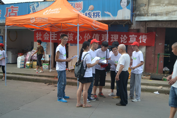 7月14至16日,大学生理论政策宣讲团来到茂林镇开展活动,得到了当地百姓的热烈欢迎。在茂林镇集市区、村民家门口,社会实践团队搭起帐篷、拉起条幅,为当地百姓讲授党的理论政策。在宣讲过程中,队员与当地百姓深入交流并发放问卷,向他们耐心讲解,对他们表达的不同看法进行了耐心的解释,得到了参与者的认可。队员们还鼓励当地群众要多通过广播、电视、网络等媒体关注国家时政要闻,关注国家发展。在宣传社会主义核心价值观时,队员们从国家、社会、个人三个层面向群众细心讲解,用电视新闻里播报的普通个人践行核心价值观的实例耐心宣传。